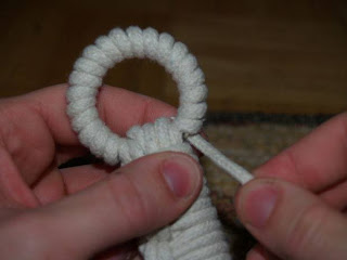5. Pegue um dos pés de mesa e faça um furo de aproximadamente 2 cm de diâmetro e passe todas as tiras por dentro dele de forma que o mais alinhadas possível, essa parte é trabalhosa e cansativa, mas se você nao quer perder material é bom q faça certinho isso